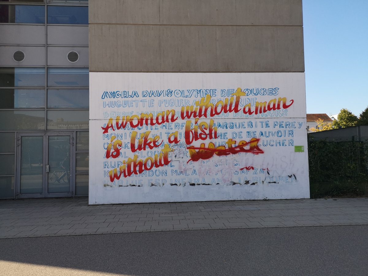 Le portiqueMur avec la phrase "A woman without a man is like a fish without water" recouvert de nombreux noms de femmes. Les préjugés ont la vie longue.