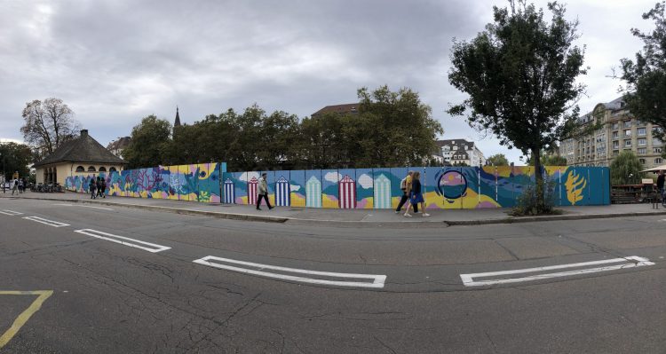 "Le long de l'Ill, sur le quai des pêcheurs de Strasbourg, une palissade. Elle suit le cours d'eau, le remonte. Un Hublot. Sommes-nous dans un sous-marin ou bien dans l'eau ? Une balade aquatique, une vue imaginée de ce qu’il se cache sous et le long de l’Ill. On sort la tête de l’eau pour longer des cabanes de plage alsaciennes."