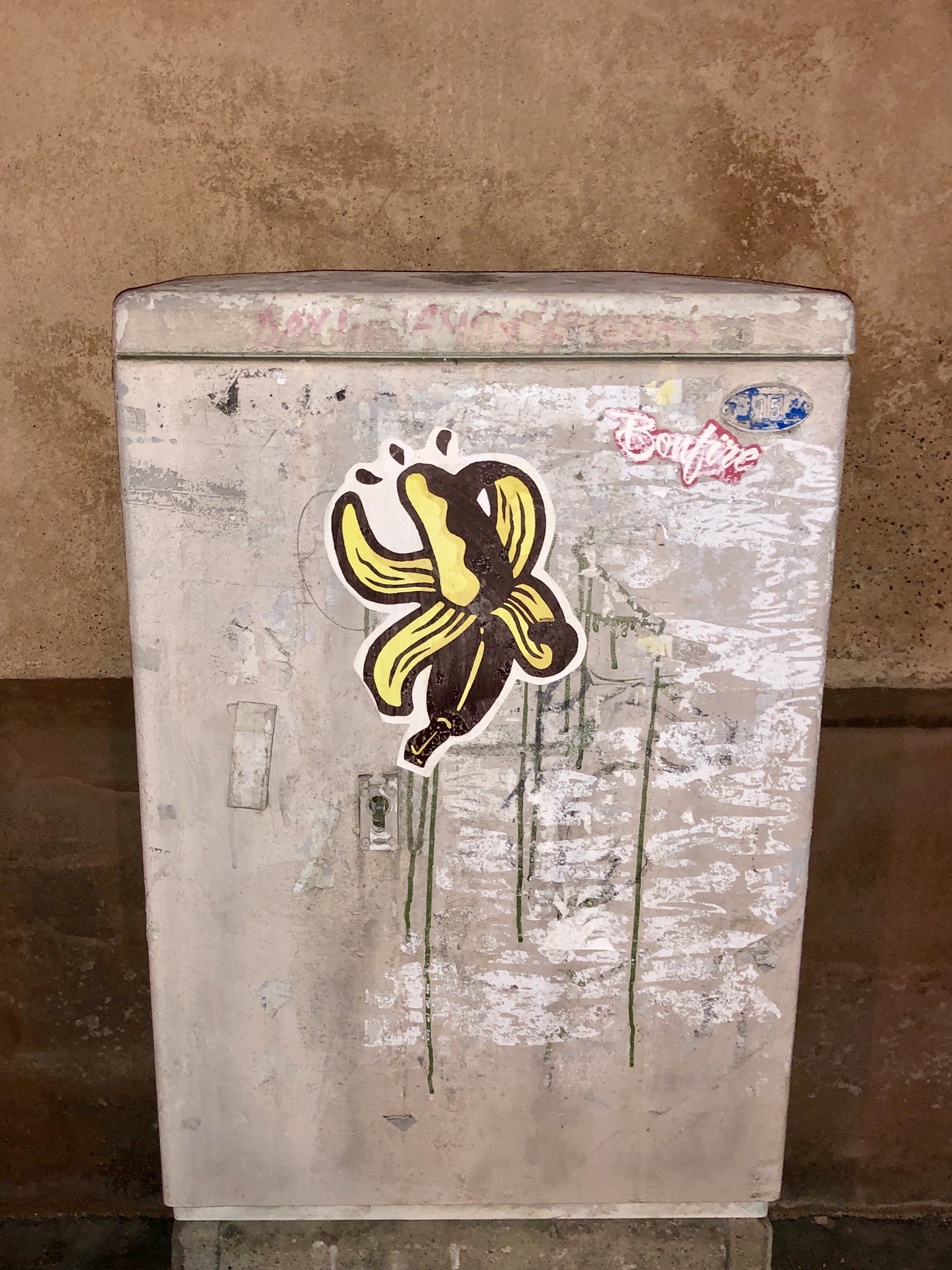 Collage Banana 2019/05 - Quais Saint-Nicolas Illustration digitale imprimée et collée sur un boîtier électrique moche. 9 Quai Saint-Nicolas, 67000 Strasbourg, France Itinéraire