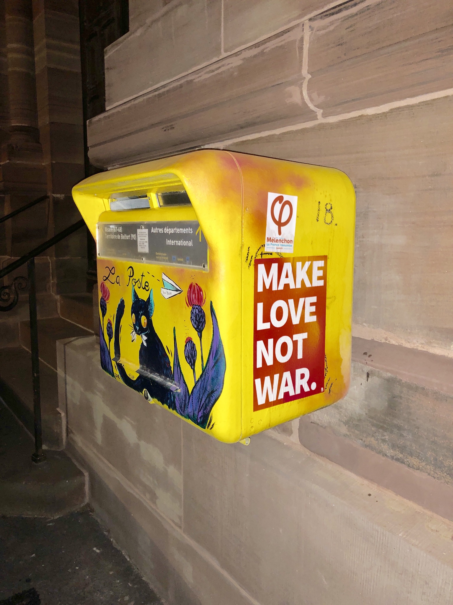 2019/05-Rue du temple neufPeinture sur une boîte aux lettres la poste par Esile ajoutée d’un message de paix collé par Bruno Bosse sur le côté.4 Rue du Temple Neuf, 67000 Strasbourg, France