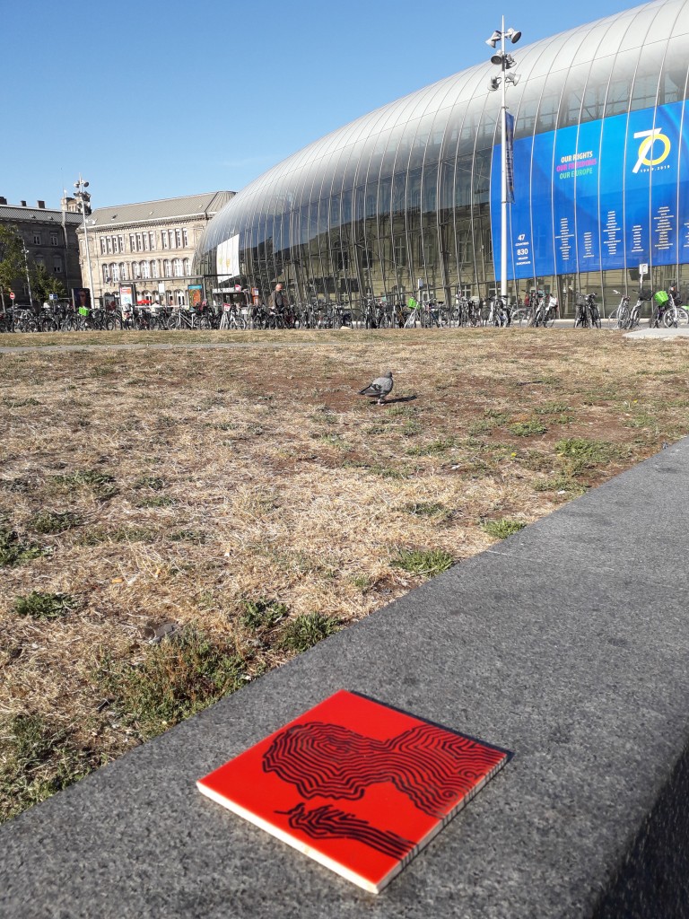 2019/09-Place de la GareCarreau de faïence rouge, 15x15 cm. Collé sur un banc en pierre, il a beaucoup vécu : pas mal de passants se sont acharnés dessus... C'est le sort voué à ce qui est accessible, malheureusement !Gare Centrale, 67000 Strasbourg, France