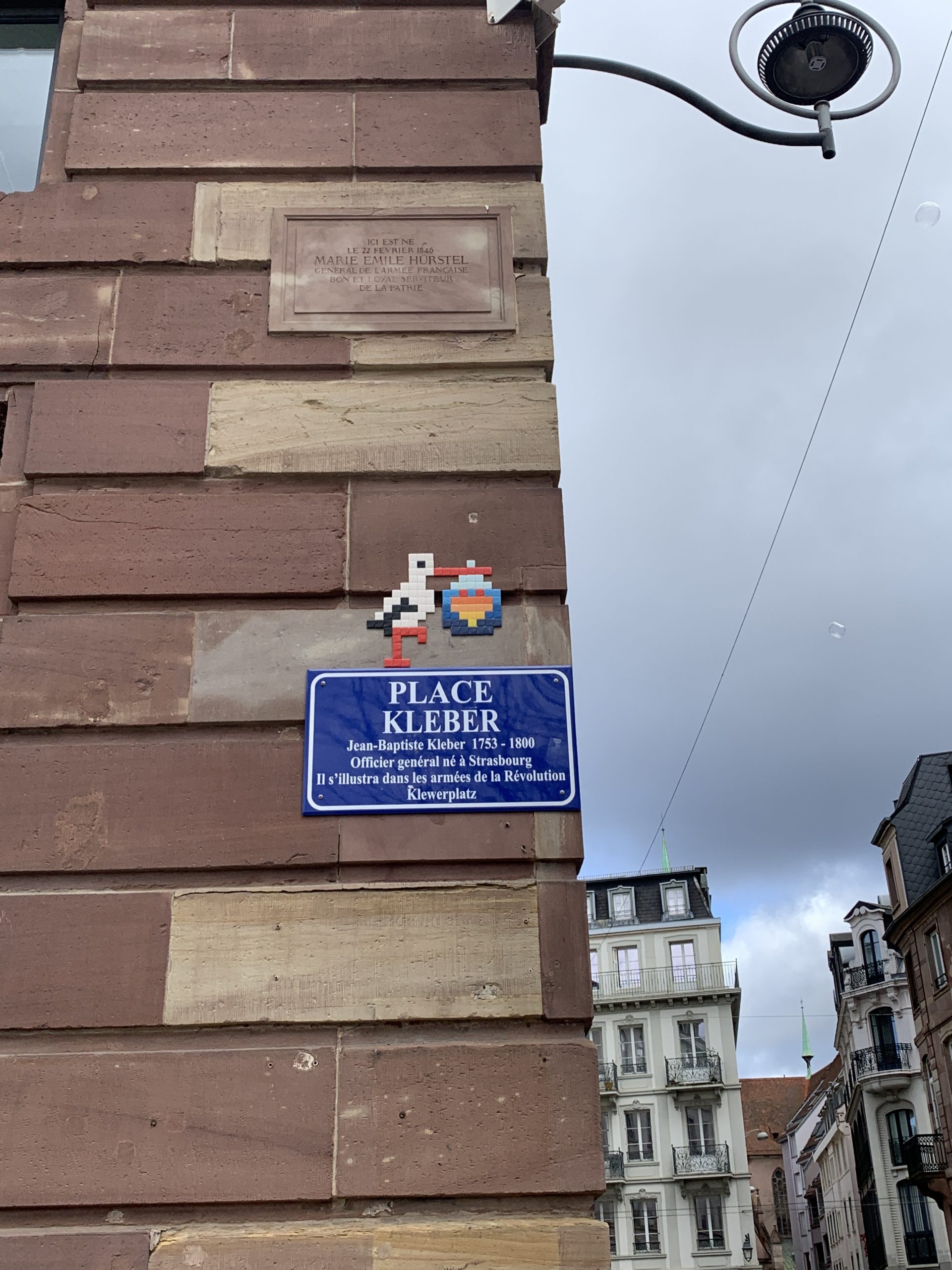 2024/03 - Angle Place Kleber et rue des grandes arcades Cigogne avec cœur orange 7 Pass. de la Pomme de Pin, 67000 Strasbourg, France Itinéraire