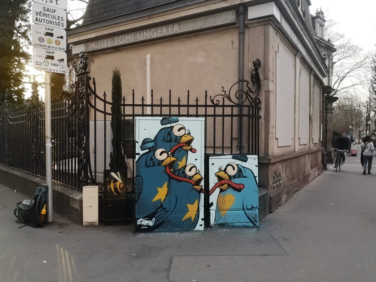 L'artiste Stom500 a réalisé, dans le cadre du projet COLORS City, une oeuvre sur le coffret situé à proximité du Musée Tomi Ungerer de Strasbourg en soutien au peuple Ukrainien et à la paix dans le monde 💛💙