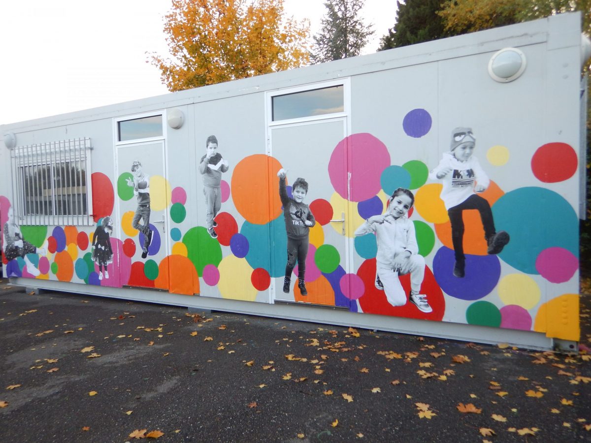 Peinture et collage, réalisé avec le public du site de l'aire d'accueil des gens du voyage.