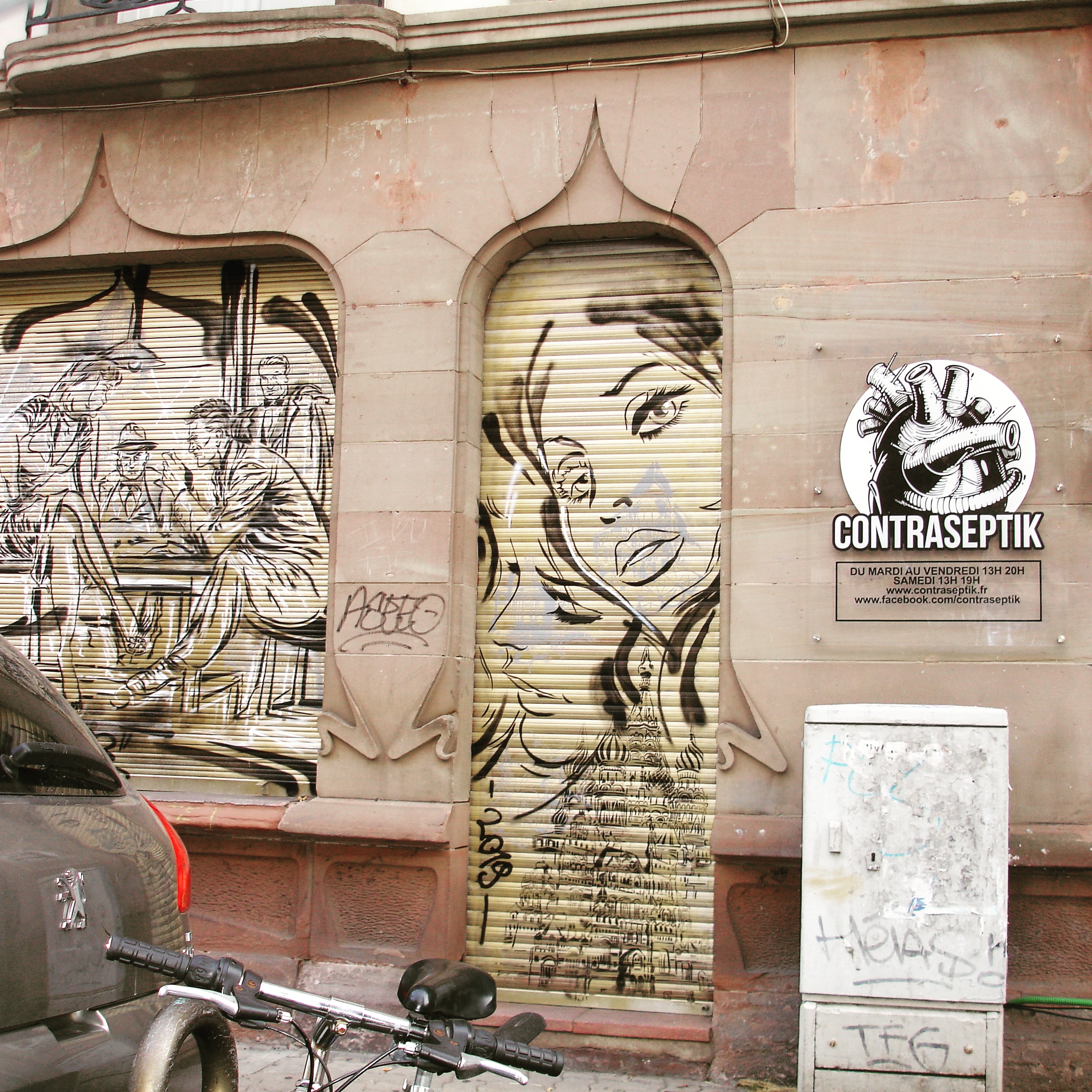 2020/08 - Contraseptik Graff sur les volets métalliques du tatoueur Contraseptik. 29 Rue de la Krutenau, 67000 Strasbourg, France Itinéraire