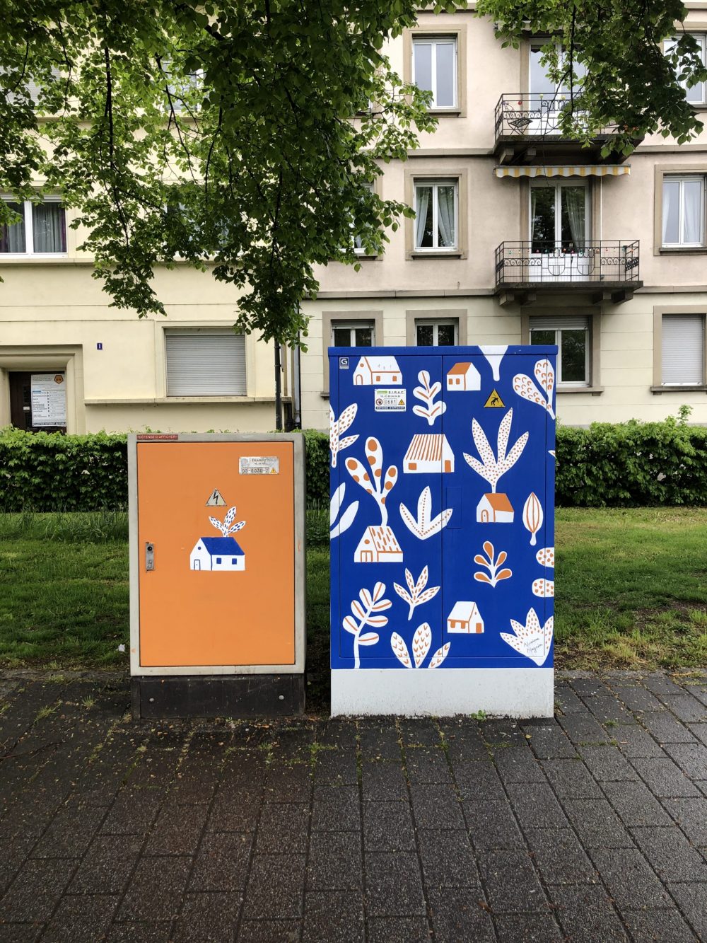 "J'ai voulu travailler en bichromie, avec un bleu bien vif et un ocre qui lui répond, ainsi que du blanc en fond. Pour les dessins, il s'agit de ce que je préfère dessiner : des plantes et des maisons, un vrai bonheur à peindre ! Le petit coffret, avec ses couleurs inversées et sa maison solitaire, fonctionne en opposition et en accord avec le grand. "