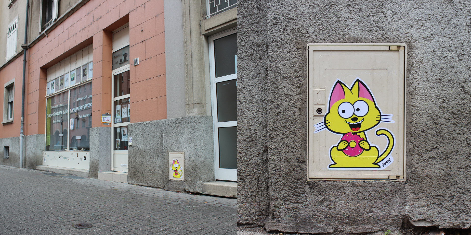 2018/10 - Chaperlipopette Collage réalisé par l'artiste SupaCat près du bar à chats Chaperlipopette. Sécurité Sociale, 67000 Strasbourg, France Itinéraire