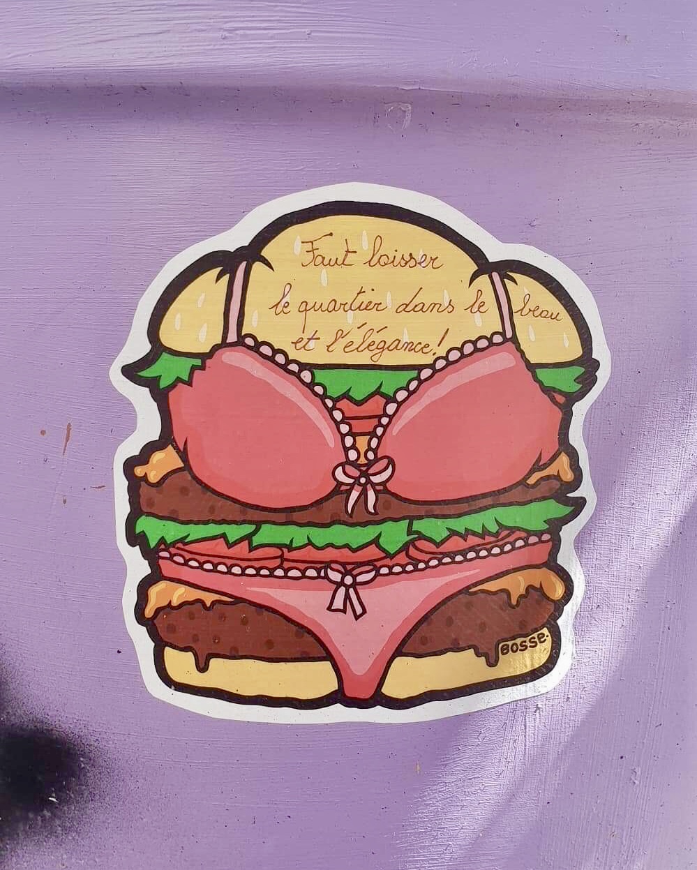 Collage Double sexy burger 2019/07 - 22 rue de Verdun Illustration digitale représentant un double hamburger vêtu de sous-vêtements féminins. Un dessin sans dessein précis mais plus pour le « fun ». Toutefois, s’il fallait donner une véritable interprétation philosophique, si l’on puis dire ainsi : dénoncer le paradoxe de vouloir être sexy tout en ne voulant faire aucun effort et en mangeant du fast food. Le paradoxe entre le canon de beauté et la puissance mondiale des fast food. 19 Rue Chopin, 67000 Strasbourg, France Itinéraire