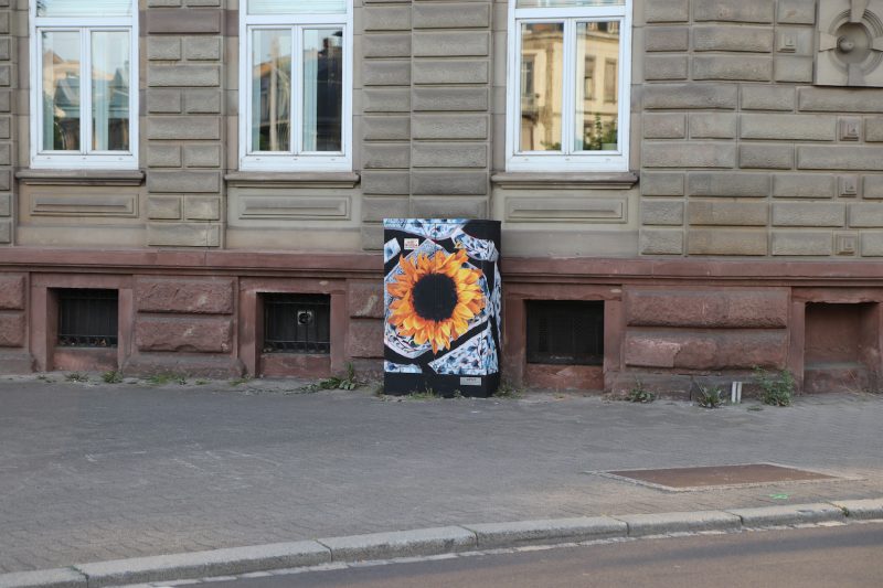 "Peinture sur boitier électrique réalisée dans le cadre du Colors Urban Art Festival et de la Fête de l’Europe 2022. Elle fait référence à la guerre en Ukraine. Les couleurs reprennent celles du drapeau. La porcelaine brisée symbolise la fracture du pays. Le tournesol est la fleur emblématique du pays avec son exportation mondiale d’huile de tournesol. Le titre de l’oeuvre fait écho au signe international de paix, de trêve et de négociation. Elle est située place Sébastien Brant, juste en face de l’ambassade de Russie à Strasbourg."