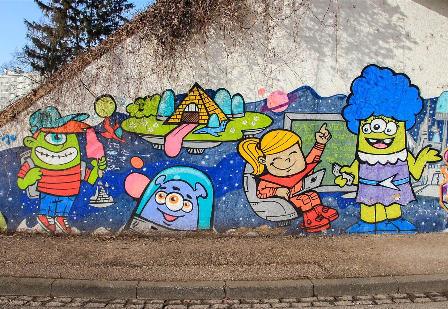 Fresque sous le pont rue Frans Hals réalisée par Jaek El Diablo dans le cadre d'un atelier en collaboration avec l'école Schongauer de l'Elsau pour la ville de Strasbourg