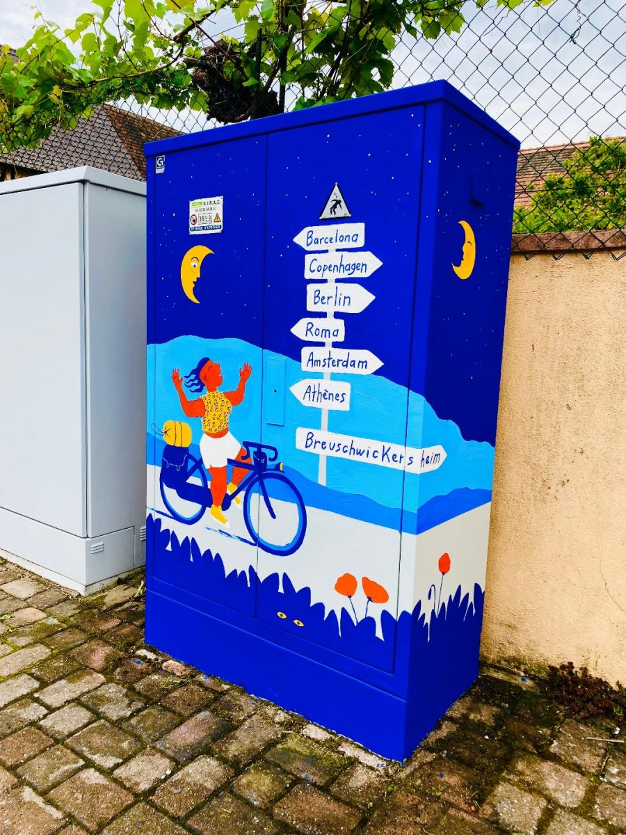 "Ce coffret est situé sur la route principale de Breuschwickersheim, flux continu de camions, voitures, bus, tracteurs... J'ai eu envie d'y proposer une évasion à vélo, un grand voyage par une femme seule, en hymne à la libre circulation des personnes en Europe.
