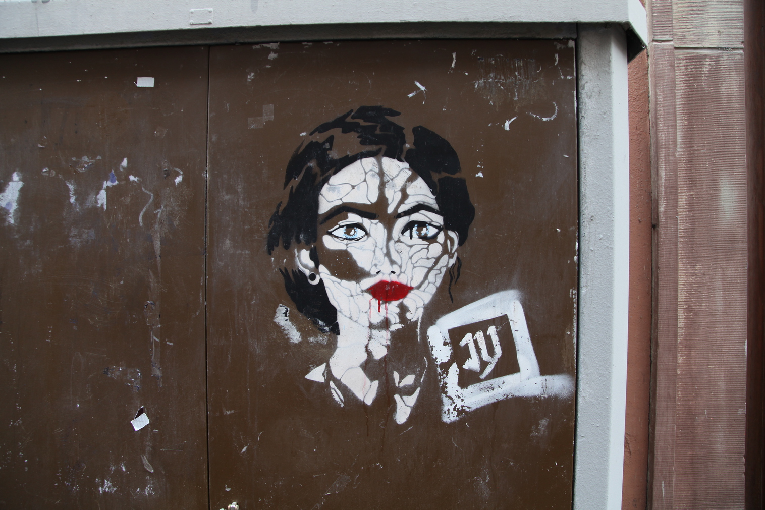 Oeuvre réalisée signée Ju, sur un boîtier rue des Drapiers.