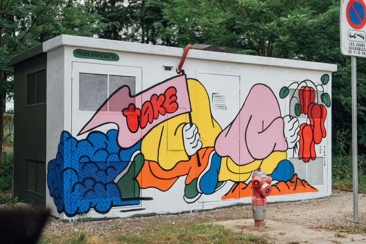 "Cette œuvre, peinte sur une structure utilitaire, capture l'essence de la spontanéité à travers des formes abstraites et des motifs botaniques. Les lignes audacieuses et les couleurs vives illustrent un monde onirique où la nature rencontre le surréalisme.  L'inscription "Take the flowers" invite le spectateur à s'approprier l'éphémère beauté des fleurs représentées, tout en célébrant la vitalité de la création urbaine."