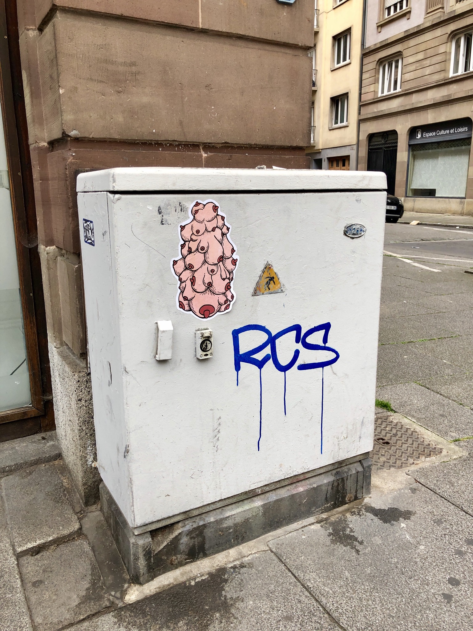 CollageFree the nipple2019/05-Rue de la 1ère armée Illustration digitale imprimée et collée sur un boîtier électrique moche.26 Rue de la 1ère Armée, 67000 Strasbourg, France