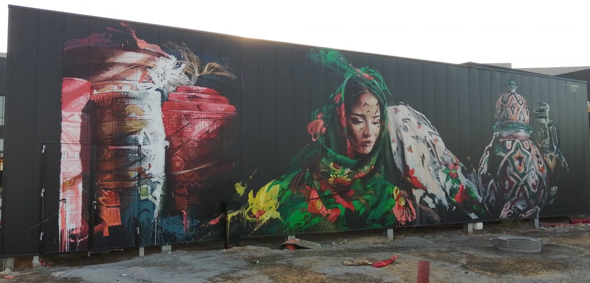 2020/09 - Extension zone commerciale de Vendenheim Mur façade d'un nouveau bâtiment commercial, fresque sur fond noir A4, 67116 Reichstett, France Itinéraire