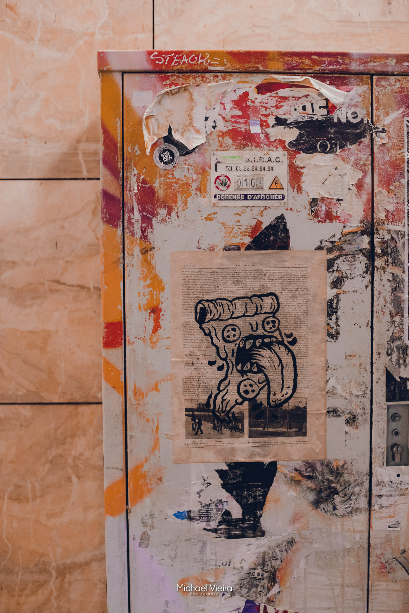 ArchivesHungry pizza2019/09-Rue du noyerImpression à la linogravure sur une page de vieux livre avec un fond de peinture au spray. L’illustration est inspirée du design de la marque Santa Cruz par l’illustrateur américain Jimbo Philips.5 Rue du Noyer, Strasbourg, France