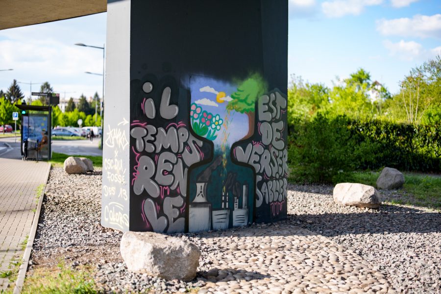 "Cette fresque participative a été réalisée par les jeunes du CSC Fossé des Treize de Strasbourg accompagné par l'artiste Jako Custom lors de la réalisation d'oeuvres artistiques sur les piliers entre la Place de Haguenau et Schiltigheim. "