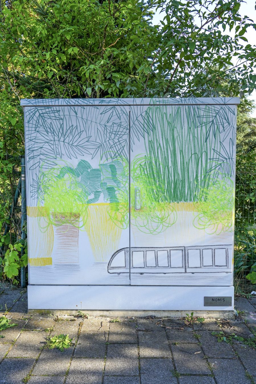 "Réalisé avec des pastels gras, cela représente un tram en jouet au milieu de plantes vertes, L’utilisation des transports doux ou en commun passe par l’éducation , les pots des plantes sont en jaune le même que stom 500 a utilisé pour les abeilles."