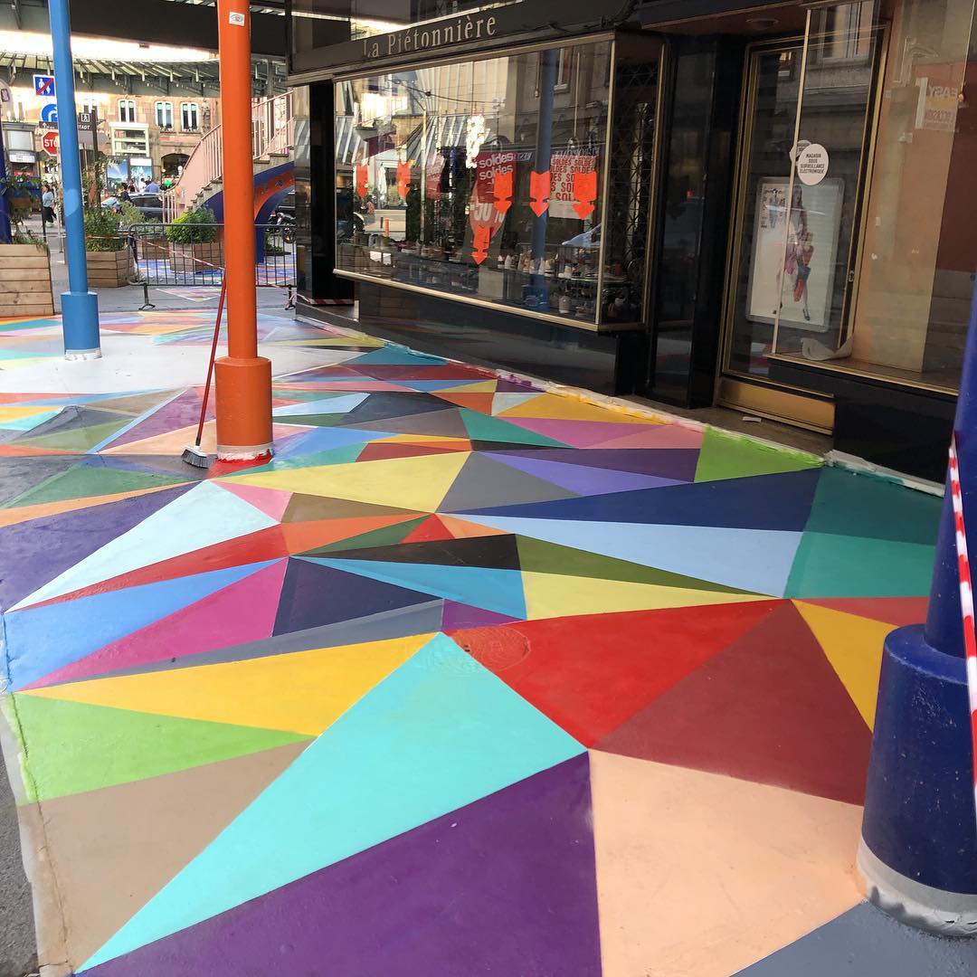 Peinture Kaleidofloor 2018/07 - Rue du Jeu des Enfants Kaleidofloor est une oeuvre réalisée par Jaek El Diablo sur le sol de la Rue du Jeu des Enfants. 56 Rue du Jeu-des-Enfants, 67000 Strasbourg, France Itinéraire