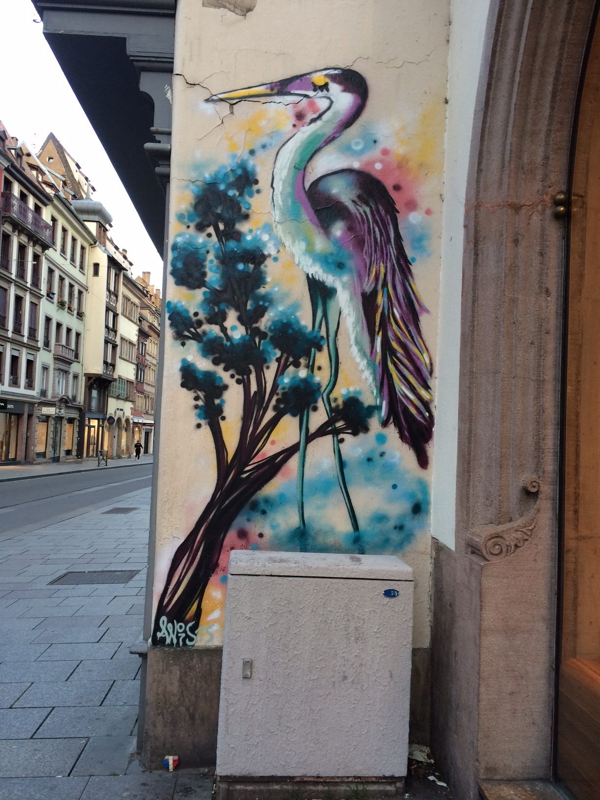 Au pied de la rue Mercière et au coin de la place Gutenberg, découvrez une peinture composée d'une cigogne colorée, perchée sur son arbre, peinte par l'artiste ANIS.