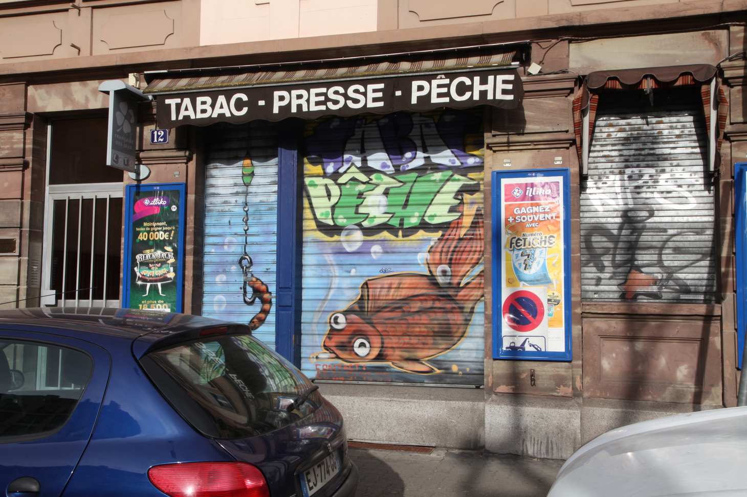 Devanture du tabac-presse-pêche situé boulevard de Lyon, signée KIPS et FLEG. Elle a été réalisée en graffiti.