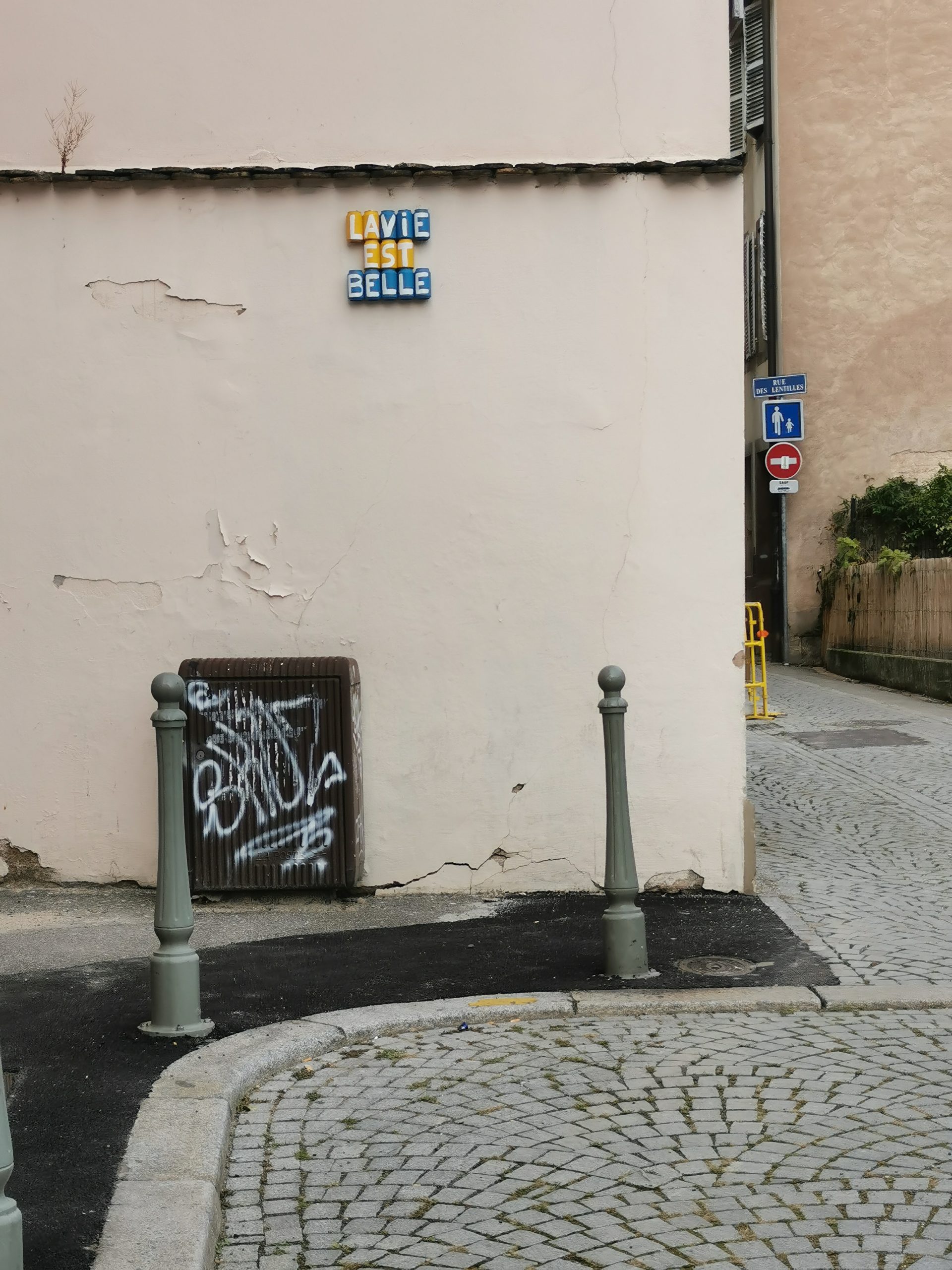 2021/10 - Angle 3 et 5 rue des lentilles Inscription en canettes "la vie est belle" par l'artiste À LA, FAÇON DE ME Lata. 3 Rue des Lentilles, Strasbourg, France Itinéraire