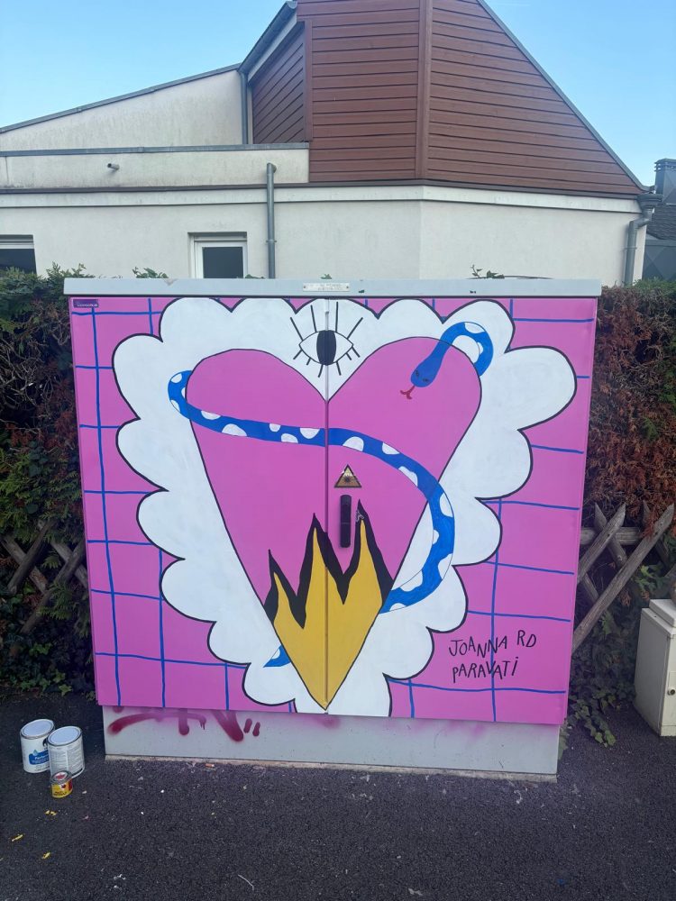 "Un fond rose pour égayer la rue, rendre heureux les gens quand ils partent au boulot le matin. Un énorme coeur en flamme car l'amour peut tout vaincre un serpent et un oeil qui protègent tout ça. "