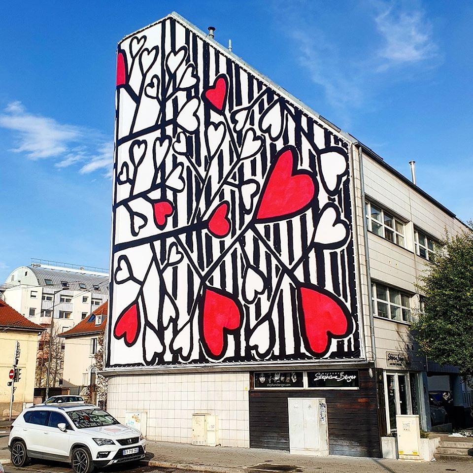 C’est l’artiste Sophie Hoang Trong qui a été choisie pour son oeuvre « L’Arbre à Coeurs », désormais exposée sur la façade du bâtiment. Cette création, issue d’une série de linogravures, représente une déclinaison d’un arbre aux fruits changeant selon leur humeur : Arbres à fleurs, Arbres carnivores et Arbres à Coeurs. Pour Sophie Hoang Trong, l’arbre est la métaphore d’un espace de vie où le partage et les liens sociaux, familiaux, amicaux et amoureux se tissent, s’enrichissent, se renforcent et s’enchevêtrent, telles des branches résistantes aux parcours sinueux de chacun. Le fruit du lien, coeur de la relation, mûrit doucement et, tel un battement, rythme une vie riche et passionnée, parfois heureuse.