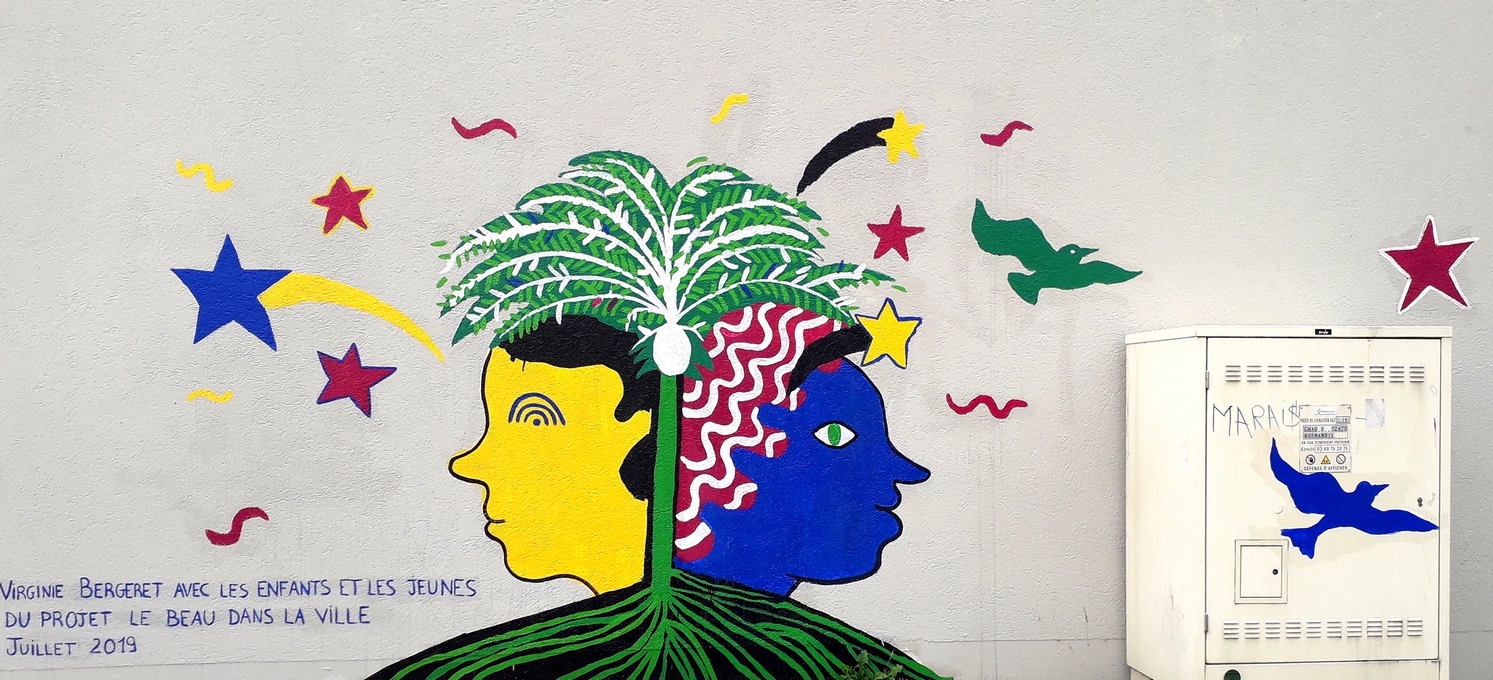 Fresque Le Beau dans la Ville - Marais 2021/01 - Rue de Normandie et rue Poitou Dans les trois quartiers le projet fait référence aux trois thèmes marquants pour les enfants et les jeunes : la famille et l’amitié au Marais, la question de l’environnement au Centre-ville et la solidarité et la multiculturalité aux Ecrivains. On y trouve pour chacune de ponctuations des éléments graphiques et symboliques récurrents : les oiseaux, symbole de liberté et d’évasion ; les mains, la solidarité et l’entraide ; les éléments naturels. 6 Rue de Normandie, 67300 Schiltigheim, France Itinéraire