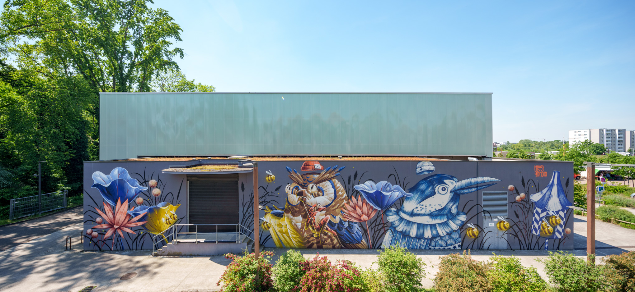 Fresque Le hibou et le pic épeiche 2024/05 - 17 allée René Cassin 67540 Ostwald Inspirés par la biodiversité locale, nous avons crée une fresque vibrante de couleurs mêlant un oiseau nocturne à un pic épeiche faisant la teuf au milieu de plantes de marais. Une scène joyeuse et colorée pour illustrer la dynamique et la richesse qui émane de ce lieu. 15 All. René Cassin, 67540 Ostwald, France Itinéraire