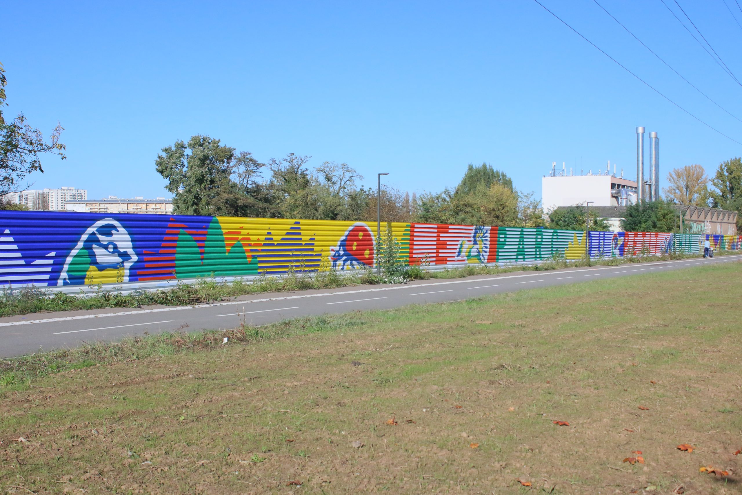 Une fresque éphémère réalisée en duo qui accompagne les travaux de transformation du quartier et annonce l'ouverture prochaine du parc du Petit Rhin. Une oeuvre commanditée par la SPL Deux-Rives."