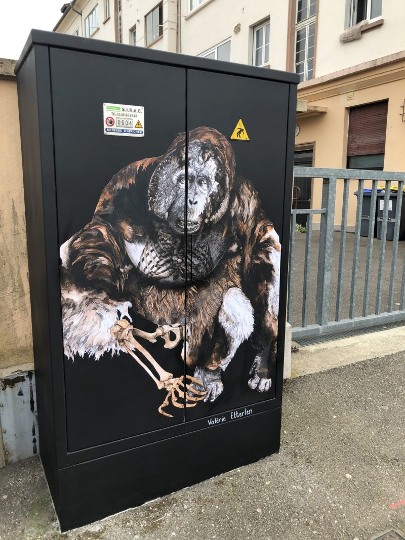 "Issu de la série de dessins Les Décharnés, cet outang outang est comme un témoin silencieux,  une image hybride entre vie et trépas, mouvement et immobilité. Le cadrage volontairement décentré crée une mise en espace de l’animal , il semble oppressé par un cadre trop petit. Son regard interroge les passants , une expression triste,  presque naïve nous retient , nous questionne et met en exergue l’état critique de nos pratiques et celle de notre société. L’animal est comme suspendu, en sursis face aux décisions des Hommes."