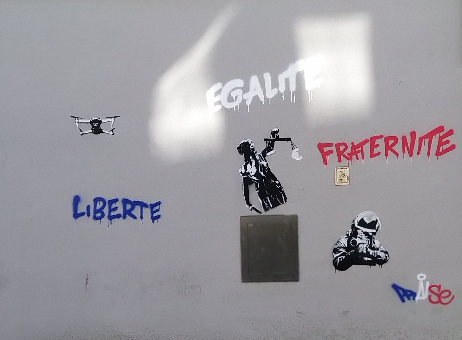 2021/02-KFC Homme de FerUne fresque bleu blanc rouge à propos des lois dites liberticides à coté du KFC de l'Homme de Fer.8 Rue du Noyer, 67000 Strasbourg, France