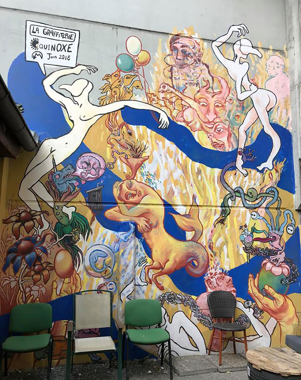 2018/07-Maison MimirLe mur du fond de la cour de la Maison MIMIR (lieu alternatif et social de Strasbourg) a été recouvert, peint à plusieurs reprises tout au long de son ouverture au public. La dernière en date, pour immortaliser la fin d'une période de "travaux" imposés par les normes ERP et la gestion 2.0 du lieu est celle ci, et va rester quelques années surement...réalisée lors du festival EQUINOXE en juin 2018.12 Rue des Pontonniers, 67000 Strasbourg, France