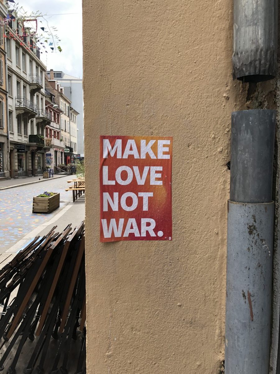 Archives MAKE LOVE NOT WAR 2019/05 - Rue du jeu des enfants Message de paix collé sur le mur. 44 Rue du Jeu-des-Enfants, 67000 Strasbourg, France Itinéraire