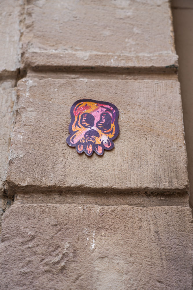 Peinture sur bois représentant un petit crâne façon cartoon sur un fond de peinture abstraite.