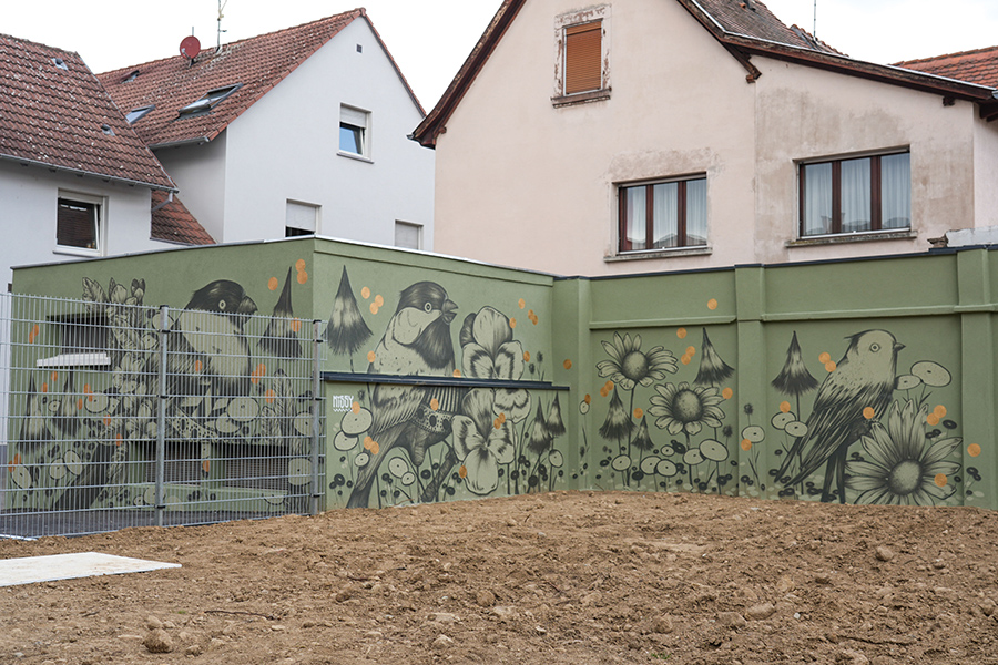 Oeuvre réalisée par Missy dans le cadre du "Hors les murs" de COLORS Urban Art Festival 2023 et l'inauguration de la nouvelle médiathèque de Bischheim, le Sapin Vert.