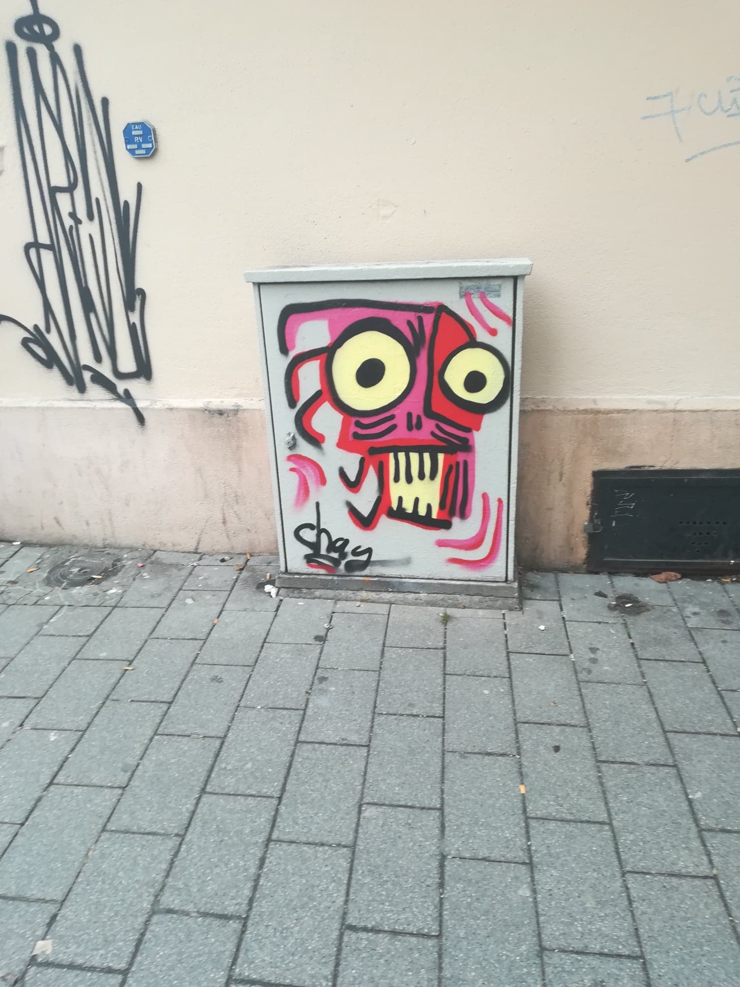 Personnage peint sur un coffret électrique en face de l'arrêt de tram Faubourg de Saverne.