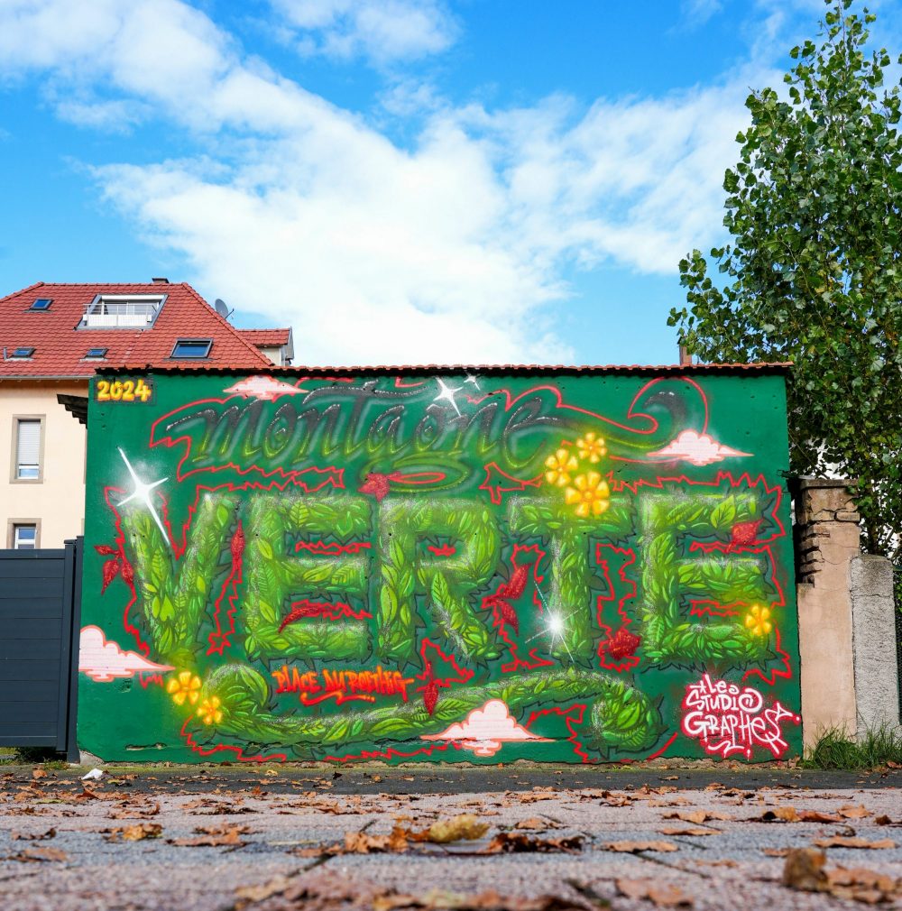 "Une frise murale participative réalisée avec les habitant.e.s du quartier de la Montagne Verte en une journée, sur le thème du quartier, de la couleur qui le caractérise, et du végétal qui s'y associe et qui habille les rues avoisinantes."