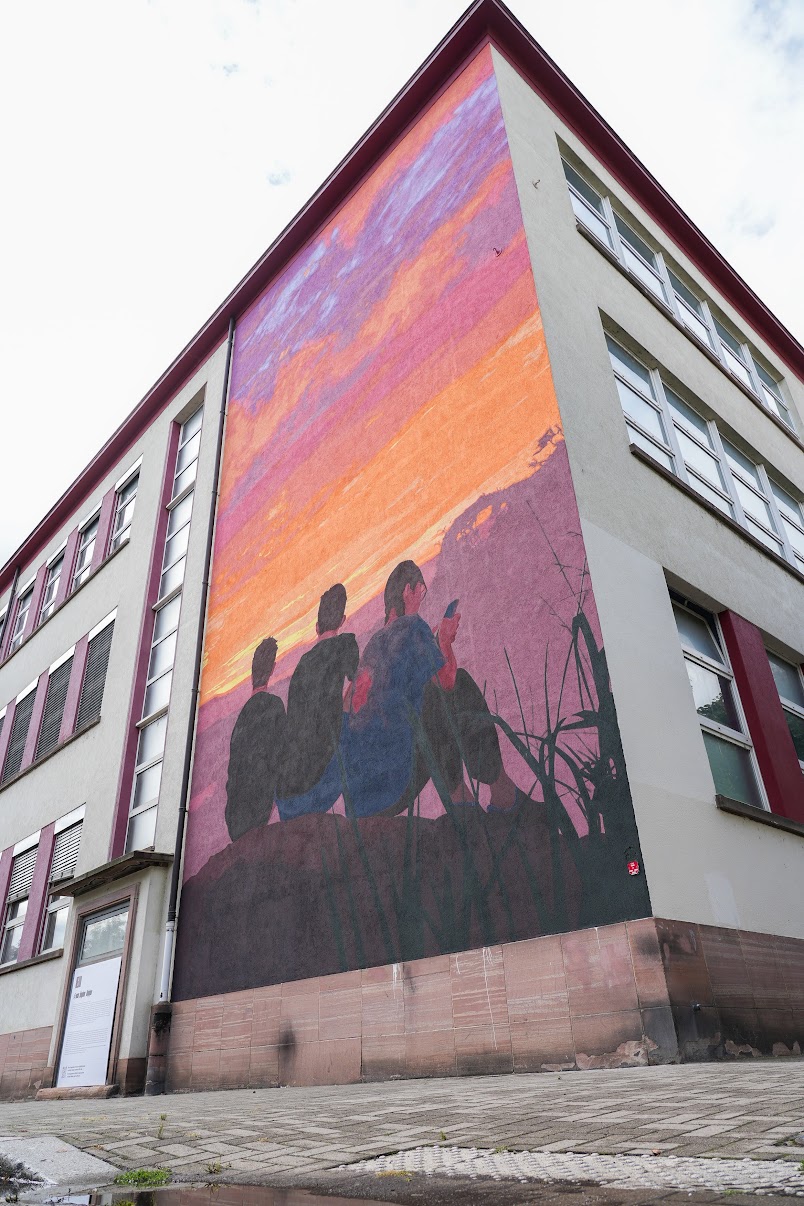 "Dès le départ, Nean nous a confié que l’école n’avait jamais été son endroit préféré. Fils d’enseignante, il s’y sentait enfermé dans un formatage, à mémoriser des dates et des noms qui lui semblaient déconnectés du réel. Ce qui l’a vraiment nourri, c’est la diversité des rencontres et la force des amitiés, même dans une période parfois pleine de doutes et de questionnements. C’est cette expérience qu’il met en scène ici. Trois adolescents sont assis de dos, face à un ciel immense aux couleurs d’un lever ou d’un coucher de soleil. Chacun peut y reconnaître son groupe de copains, ce refuge précieux où la sincérité et la loyauté donnent de la force. L’amitié devient alors un carrefour rassurant, un abri qui aide à traverser l’adolescence et, plus largement, le monde d’aujourd’hui. La fresque, intime et sensible, capte un moment que chacun connaît : trois amis assis, le temps qui s’arrête, et le ciel qui prend toute la place. On devine les rires, les confidences, les silences partagés... Le décor devient plus grand que les personnages, comme pour rappeler que l’amitié se vit dans ces instants simples, à l’abri du tumulte. Le ciel, vaste et coloré, enveloppe les silhouettes et chuchote qu’un autre monde est possible, à chacun de l’imaginer, à nous de l’inventer ! C'est parti !"