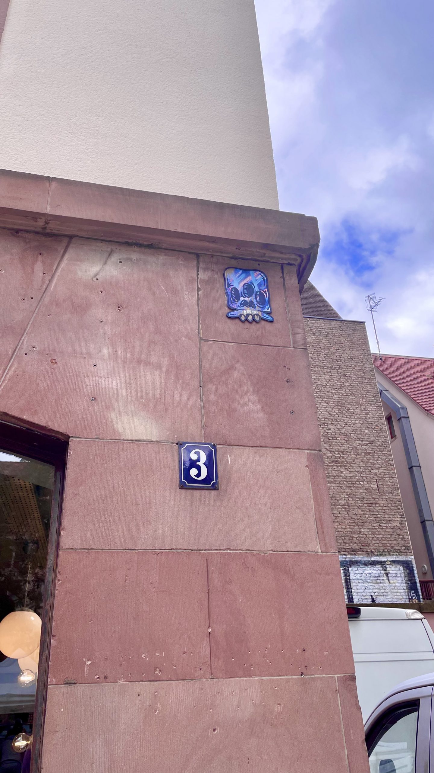 2022/09-Rue du Vieux-Marché-aux-PoissonsPeinture à l’acrylique sur bois, représentant un petit crâne coloré.3 Pl. du Vieux Marché aux Poissons, 67000 Strasbourg, France