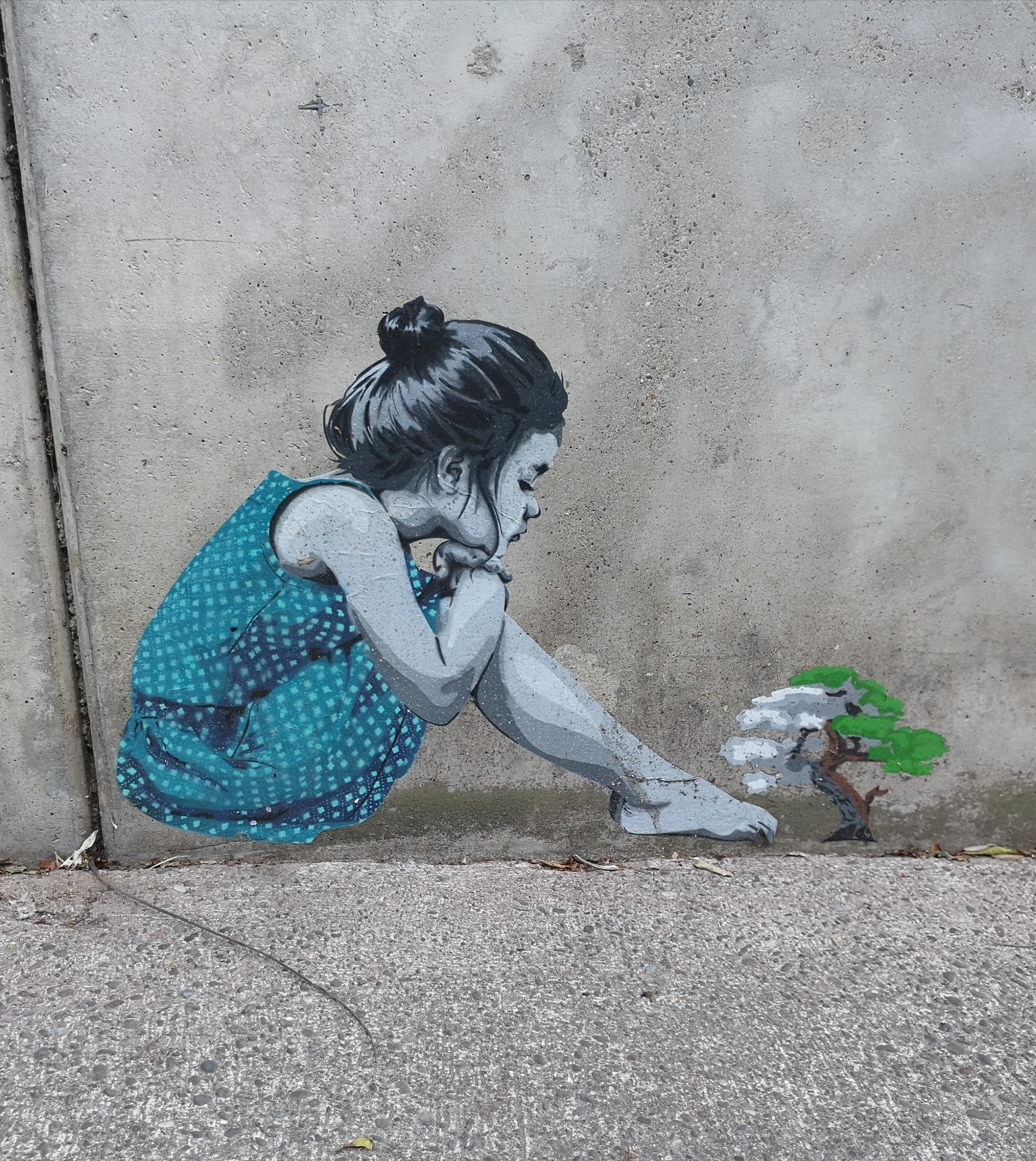 2019/09 - Place Jean-Hans Arp Collage dans la descente près de l'amphithéâtre de l'ENA réalisé par SeiLeise. Place Hans-Jean-Arp, Strasbourg, France Itinéraire