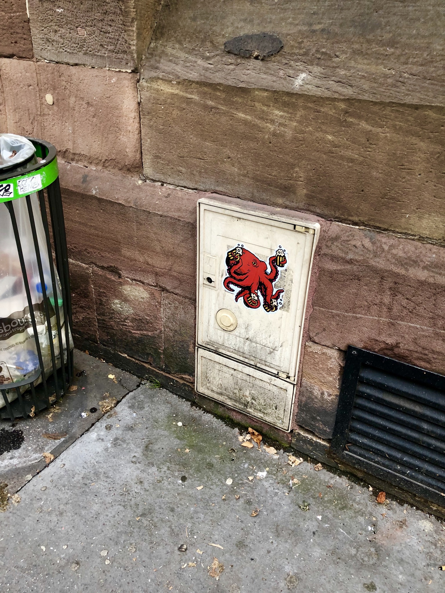 2019/10-Quai FinkwillerUne illustration digitale imprimée et collées sur un boîtier électrique moche représentant un poulpe bourré, un poulpe alsacien ;)Saint Thomas Finkwiller, 67000 Strasbourg, France