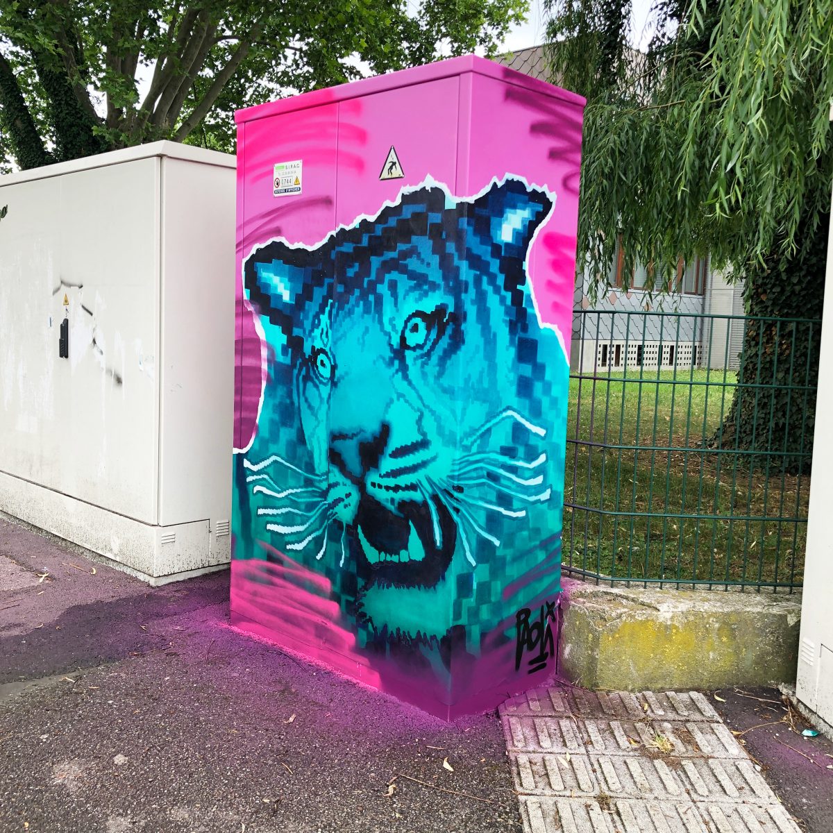Oeuvre réalisée par Joe Paoli sur un coffret électrique dans le quartier de la Meinau de Strasbourg pour le projet COLORS City 2020.