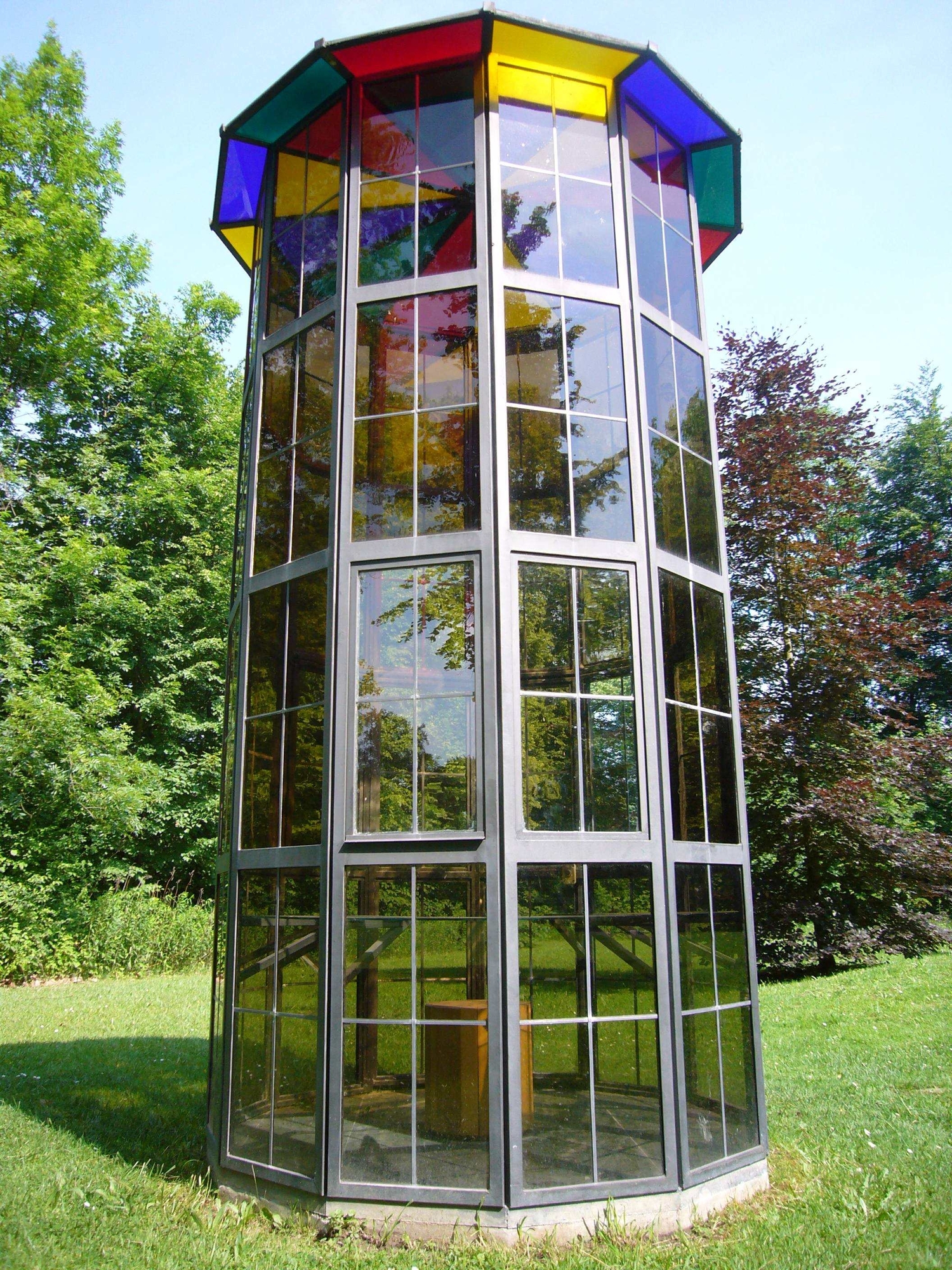 2018/04 - 161 rue Mélanie Le projet conçu par Sarkis consiste en une construction constituée d'une armature de fer sur les parois verticales de laquelle sont insérés des verres de couleur ocre clair, sur le toit, des verres de couleur bleu, rouge, jaune et vert. A l'intérieur, une tablette de verre est destinée à accueillir une boîte d'aquarelle utilisable par un artiste qu'attend un siège de hêtre : c'est l'atelier créé par Sarkis pour d'autres artistes, un atelier libre d'être ouvert à toute personne sollicitant son occupation temporaire. Cette structure lumineuse, dont exulte une polyphonie colorée, avec cette qualité de transparence et de réverbération rappelant l'aquarelle chère à Sarkis, était située Près de l'arbre brûlé, un hêtre mort aux branches amputées, conservé et mis en scène par Sarkis mais disparu depuis. L'hommage à Mathias Grünewald suggéré dans le titre est sensible quand on pense à la représentation d'arbres morts dans sa peinture et notamment dans un des panneaux du Retable d'Issenheim au Musée Unterlinden de Colmar.