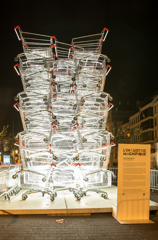 Dans «Rayonnements» l’artiste accumule les chariots comme les marchandises le sont. Les chariots deviennent contenus et contenants.
