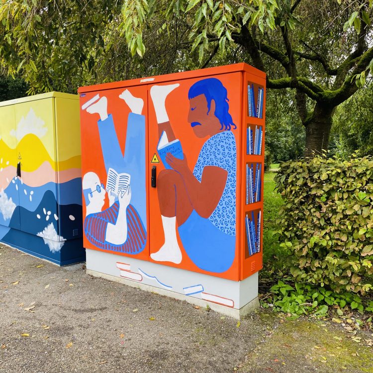 "Situé en bordure d'un parc, ce coffret est une invitation à la lecture, et un hommage aux boîtes à livres. Sur le côté droit, une sélection des BD et essais féministes que les personnages coincés dans l'armoire sont en train de découvrir."