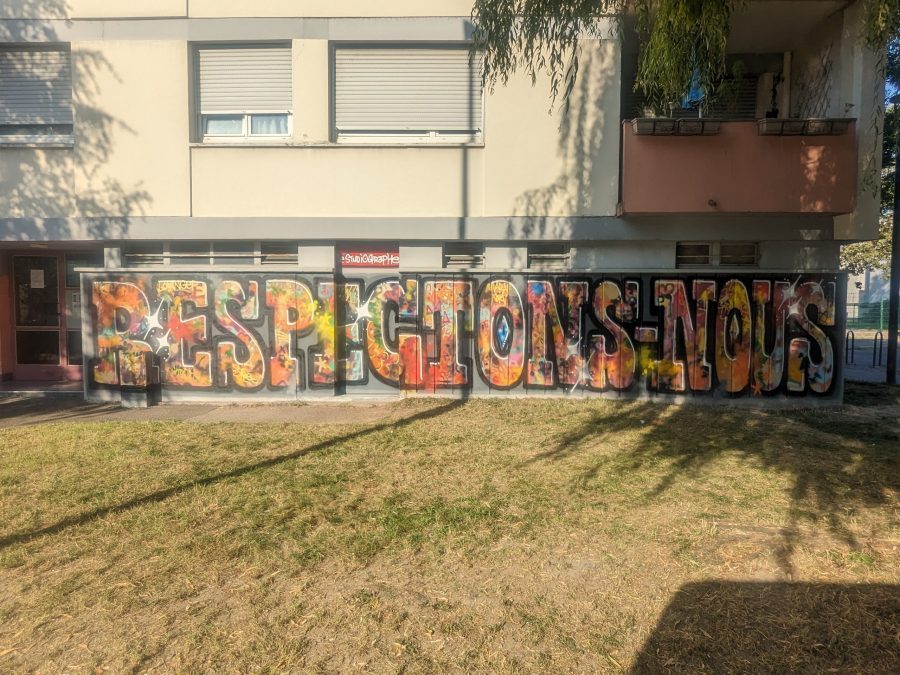 Fresque participative réalisée par Le Studiographe et les jeunes du quartier du Marais à Schiltigheim pour les 70ans de Foyer Moderne Schiltigheim.