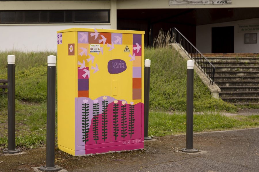 "Le long de la grande rue de L'Ill où les voitures et le bruit sont omniprésents, un îlot de couleurs qui appelle une respiration, une pause, un autre regard sur la ville. Les couleurs vives, les fleurs et les oiseaux aux contours simples sont visibles depuis le siège de sa voiture ou de l'autre côté de la rue, chaque passant peut se laisser rêvasser le temps d'un regard."
