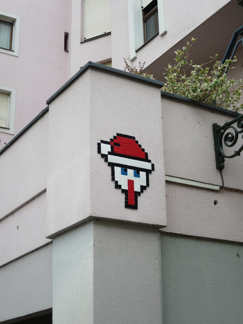 2018/11 - Place des Moulin Mosaïque de Stork représentant une cigogne Père Noël. 4 Place des Moulins, 67000 Strasbourg, France Itinéraire